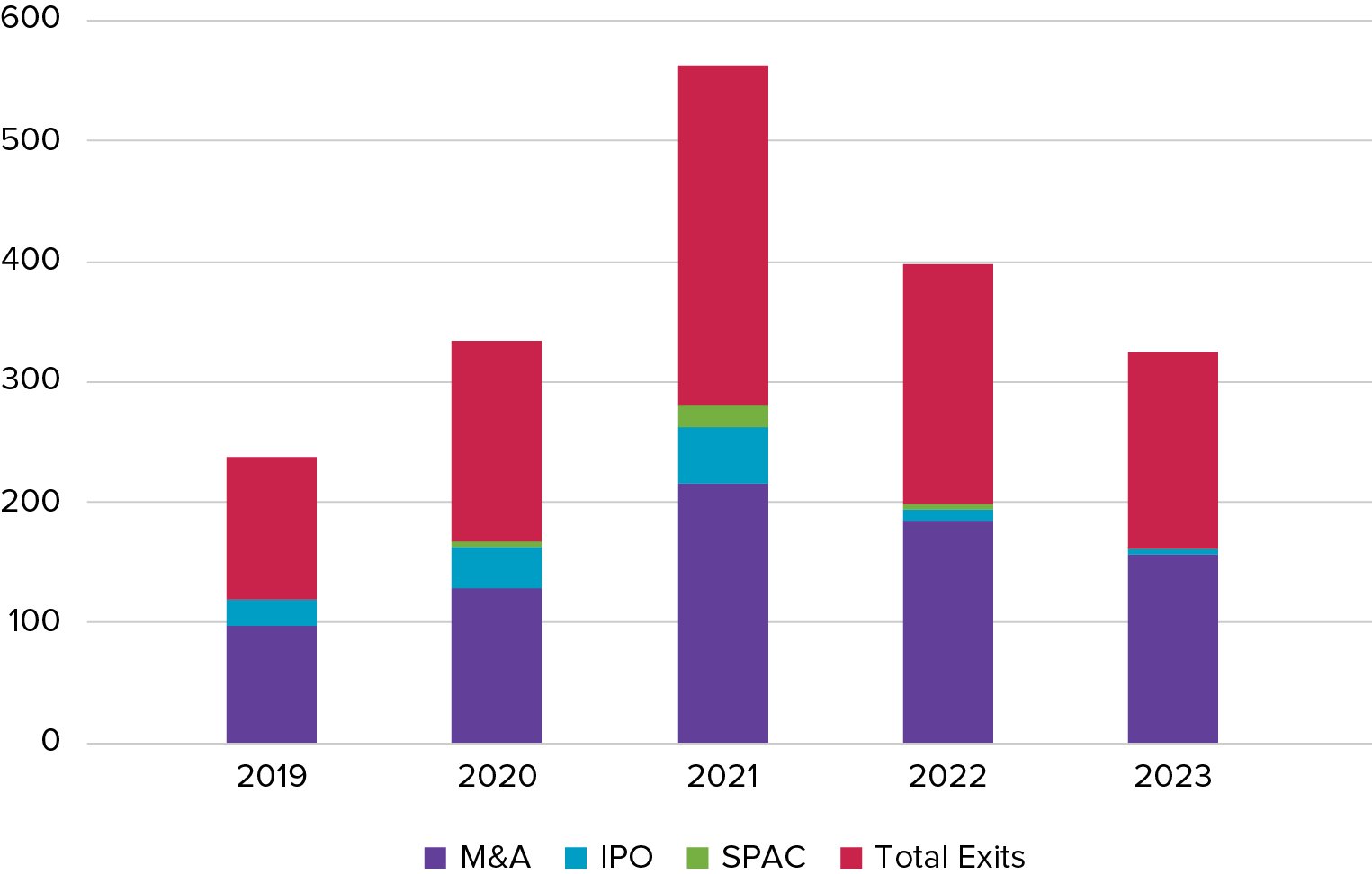 The realm of mergers and acquisitions (M&A) has witnessed a notable deceleration, while initial public offerings (IPOs) and Special Purpose Acquisition Company (SPAC) activities remain scant, especially evident in Europe where the absence of recorded IPOs further underscores the industry's subdued state. [See chart: Global Digital Health Venture Exit History].