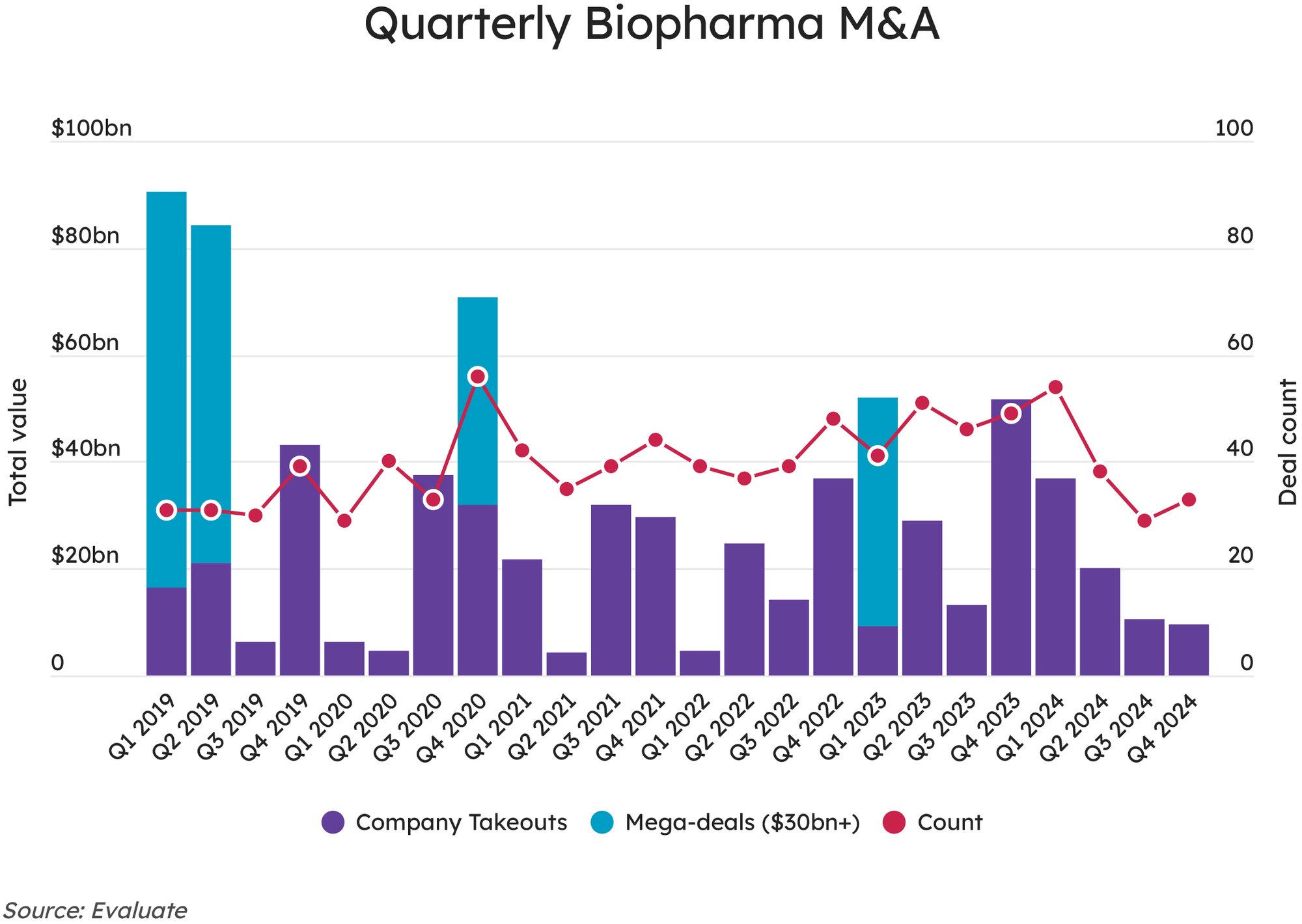 The fourth quarter of 2024 reversed a trend seen in the prior two years, when M&A activity surged during the final three months of the year. In Q4 2023, the biopharma sector made 49 M&A deals valued at more than $52bn, highlighted by a pair of $10bn-plus takeouts, and in 2022, the final quarter’s totals of 48 acquisitions valued at more than $37bn made for the busiest quarter of that year.