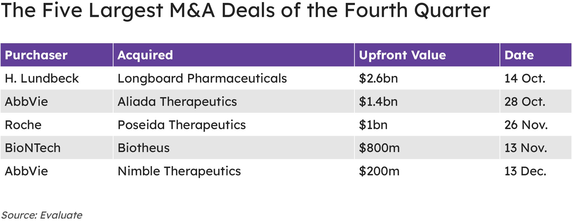 The biopharma sector did not even approach a purchase of that size during Q4, as H. Lundbeck’s $2.6bn acquisition of Longboard Pharmaceuticals ended up the highest-valued deal announced in the final three months of 2024. It was one of just three acquisitions valued at $1bn or higher during Q4.