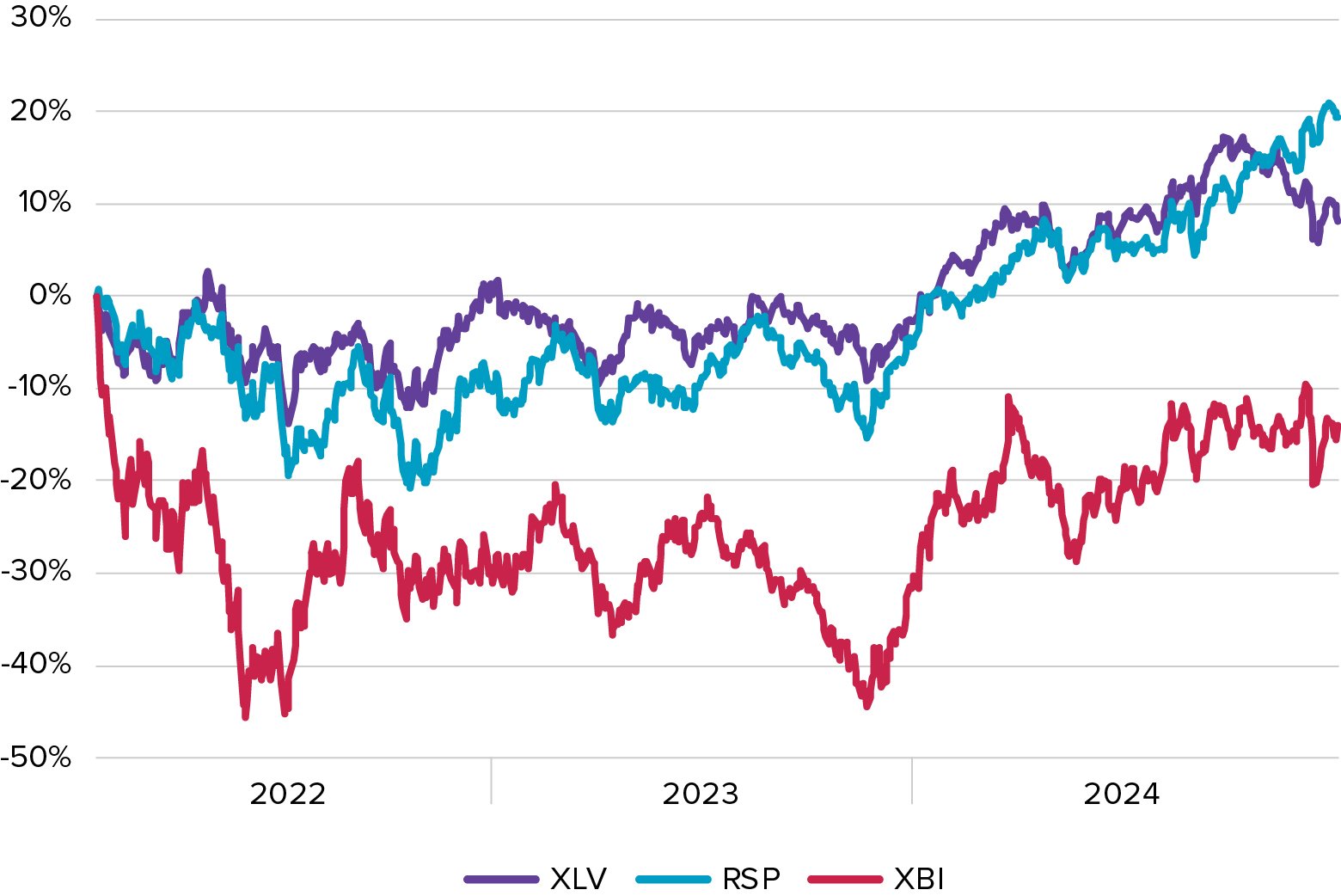 The situation was exacerbated in November by Trump’s leftfield choices for running US healthcare. The chart here shows how this issue hit more established, larger biopharma companies than small biotechs. The XLV, a broader index that encompasses the wider healthcare sector, remains below its pre-US election peak. President Trump’s plans for the Affordable Care Act, Medicare drug price negotiation and tariffs on imports from abroad are all keenly awaited and how they play out will be big themes for healthcare in 2025.