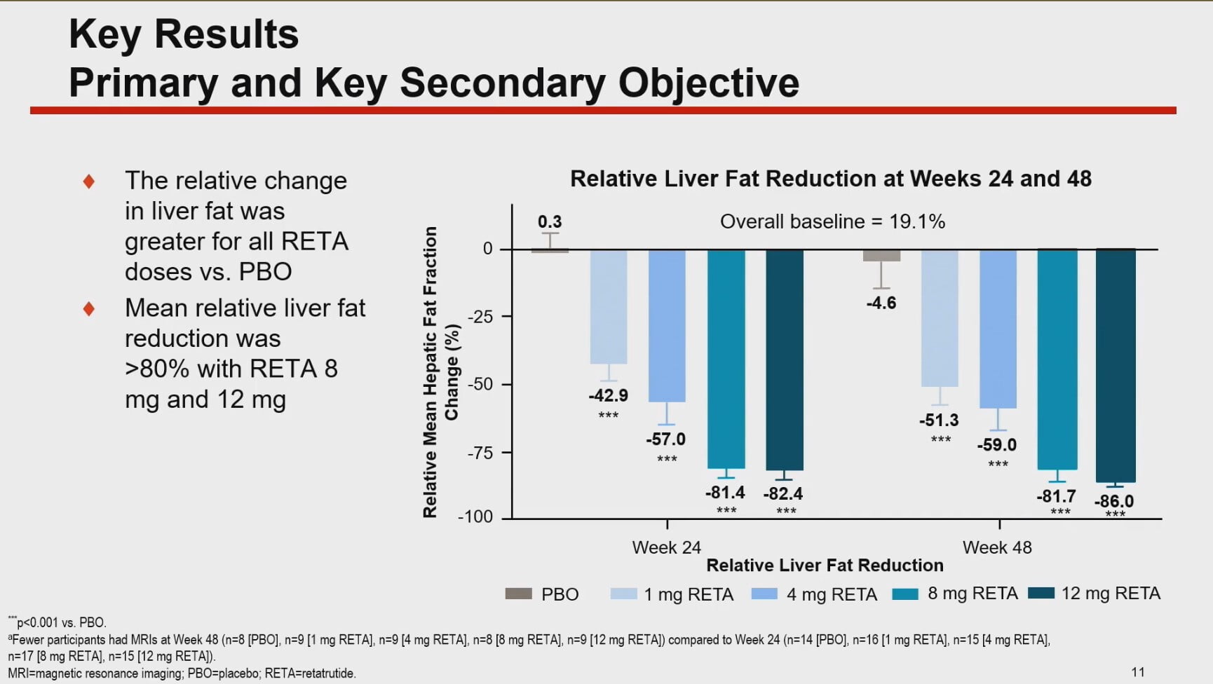 Patients in the phase 2 obesity trial who had liver fat of greater than 10% were enrolled into this prespecified Nafld subgroup. After 24 weeks the 8mg and 12mg weekly doses produced complete resolution of excess liver fat in around 80% of those eligible for the analysis. At 48 weeks these responses had deepened slightly.