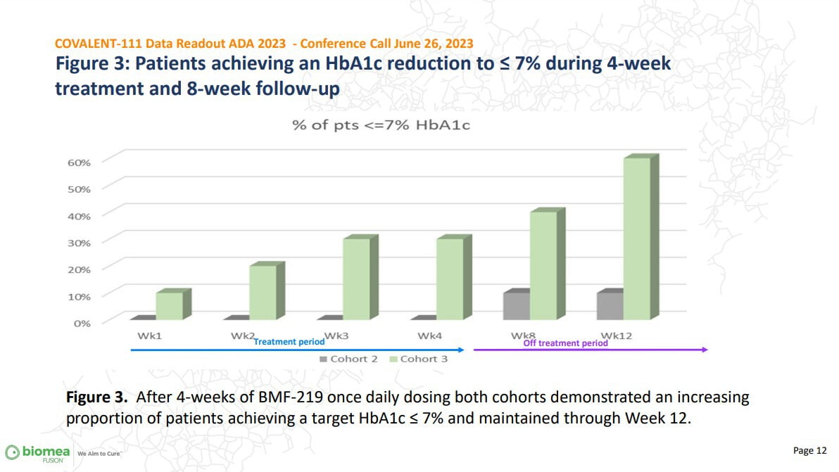 Cohort 2 received 100mg BMF-219 or placebo daily for four weeks, taken with food; cohort 3 the same but without food. At the four-week point impressive cuts to blood sugar were seen in these groups, though placebo response was also high.