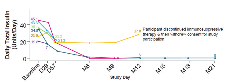 VX-880 comprises “naked” allogeneic pancreatic islet cells that are said to be able to detect glucose levels and release insulin in response. It requires immunosuppression to prevent rejection of the cells.