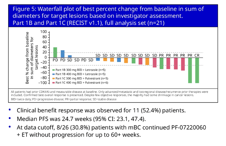 PF-07220060 was the subject of its own poster, concerning early data from a similar solid tumour trial enriched for breast cancer patients failed by CDK4/6 inhibition. Once again, lack of single-agent activity was seen, with 18 cases of stable disease being the best responses from 29 evaluable patients.