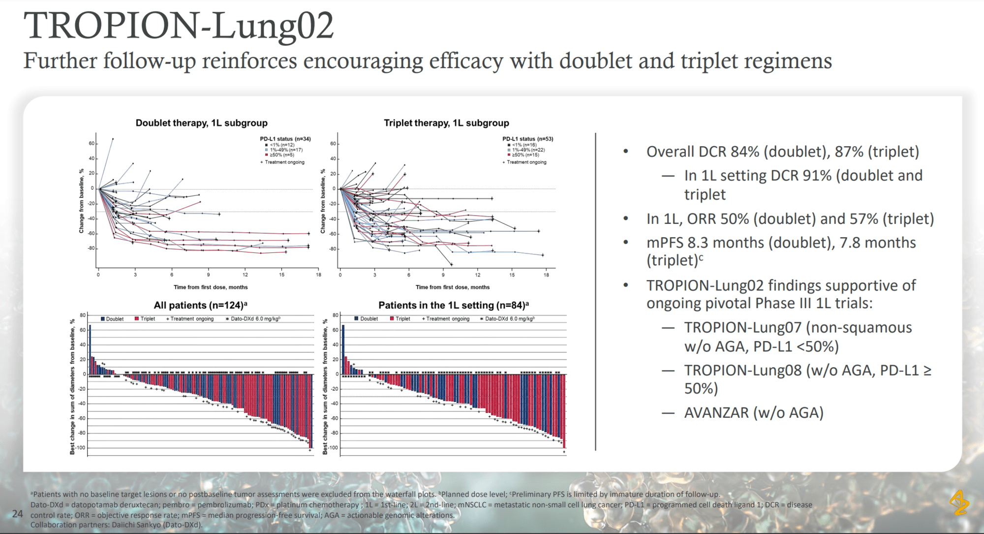 The partners have three large pivotal first-line trials under way already, so emerging results from the phase 1b Tropion-Lung02 Keytruda combo trial are being closely scrutinised for signs of early efficacy. Response rates are encouraging, but the dataset is still relatively early and has deteriorated slightly from the Asco abstract, which concerned an earlier cut.