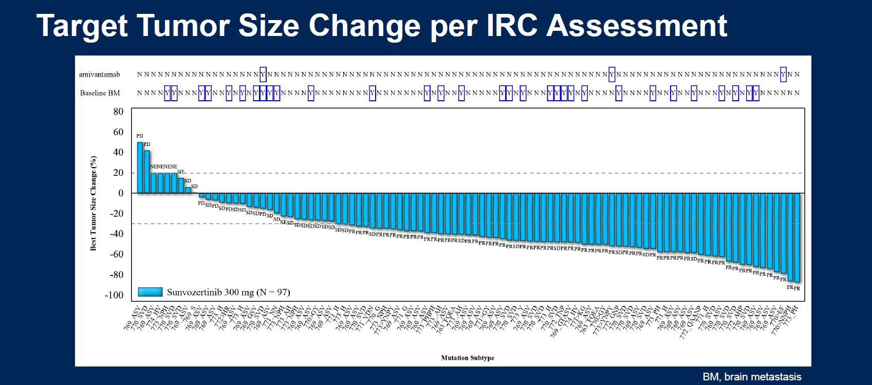 “One of the design criteria [for sunvozertinib] was that it had to be equally potent against all insertion mutations,” says Zhang, and so in addition to EGFR activating mutation activity the molecule shows “almost equal potency across around 30 types of exon 20 insertions”. And then there is front-line use in exon 20 insertions, where ORR stands at 71%.
