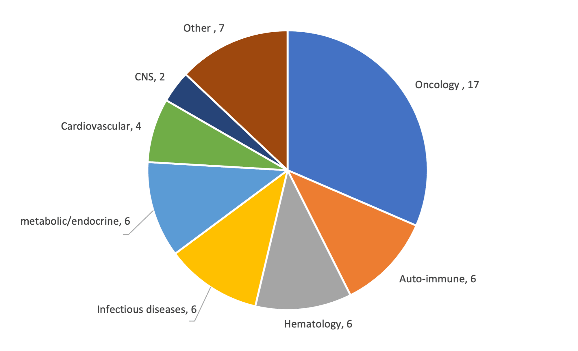 There were fewer surprises on other counts. There were 61 approvals in total, of which we have included 54* in this analysis (see note - right). These figures represent close to a ten-year average; a re-balancing, perhaps, after 2023’s exceptionally high count (71)- and 2022’s unusual low (39). Cancer still dominates, with 17 new drugs, including 6 of the 10 Accelerated Approvals and three cell therapies. But auto-immune, hematological, infectious and metabolic/endocrine conditions each gained a half-dozen new therapies, there was a quartet of CV approvals and 2024 also welcomed two CNS newcomers, Bristol Myers Squibb’s Cobenfy for schizophrenia and Eli Lilly’s donanemab for Alzheimer’s disease. (See Chart 1 & Table 1)