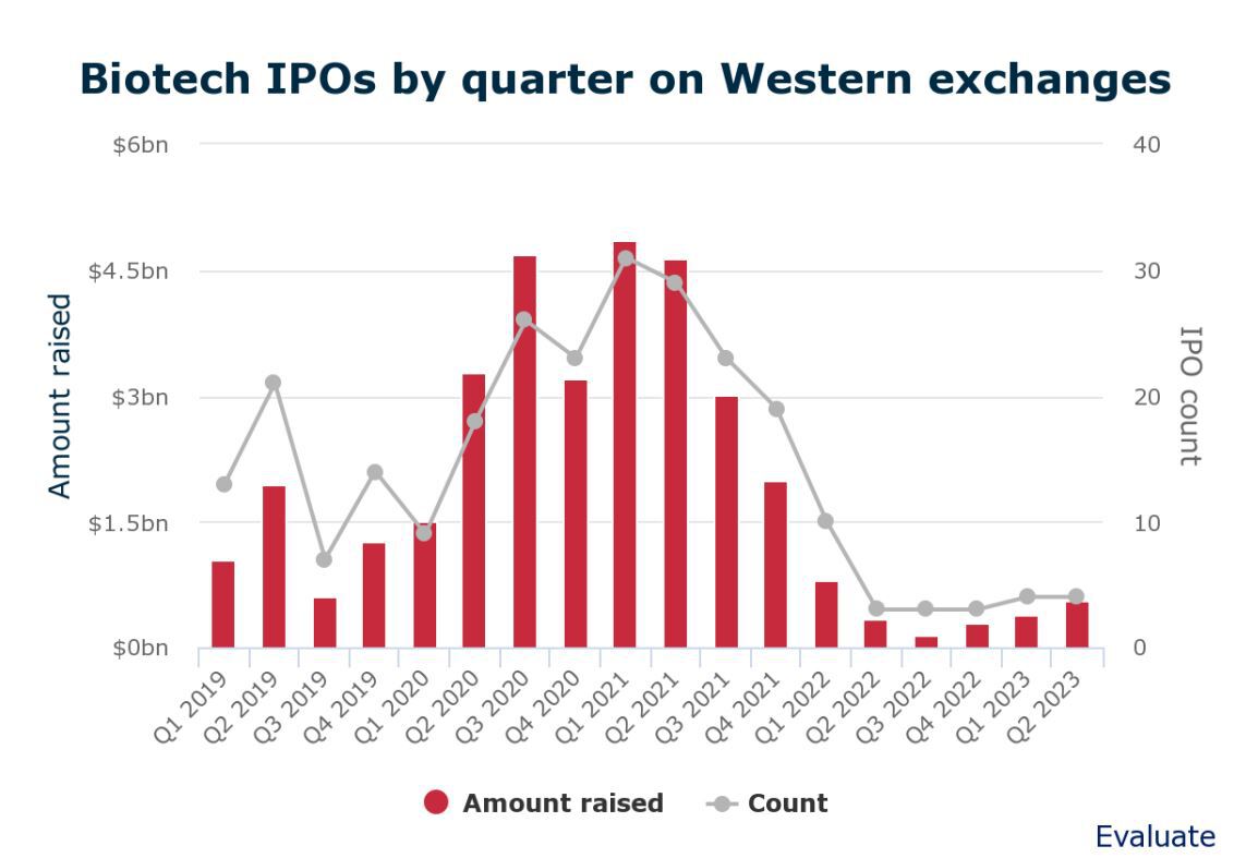 Still, wider conditions are far from buoyant. The XBI, a closely followed index of biotech stocks, has recovered from March lows but is only a couple of percentage points up on the year. The Nasdaq Biotechnology Index is down slightly. The situation remains dire in Europe, where no full IPOs have happened since February 2022.