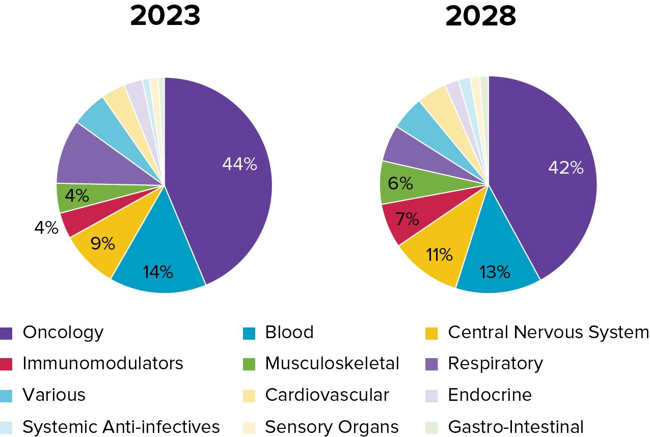CNS orphan drug sales will more than double between 2023 and 2028, by which time they’ll make up over 10% of orphan sales by value. This reflects broader industry interest in this once-neglected area: witness AbbVie’s $8.7 billion acquisition of CNS-focused Cerevel or Bristol Myers Squibb’s $14 billion Karuna deal, both announced in December 2023. Immunomodulators – another popular space, as per Merck’s $10.8 billion Prometheus Biosciences deal last April – are also grabbing a bigger share of the orphan pie. They will almost triple, reaching 7% in 2028, up from 4% in 2023.