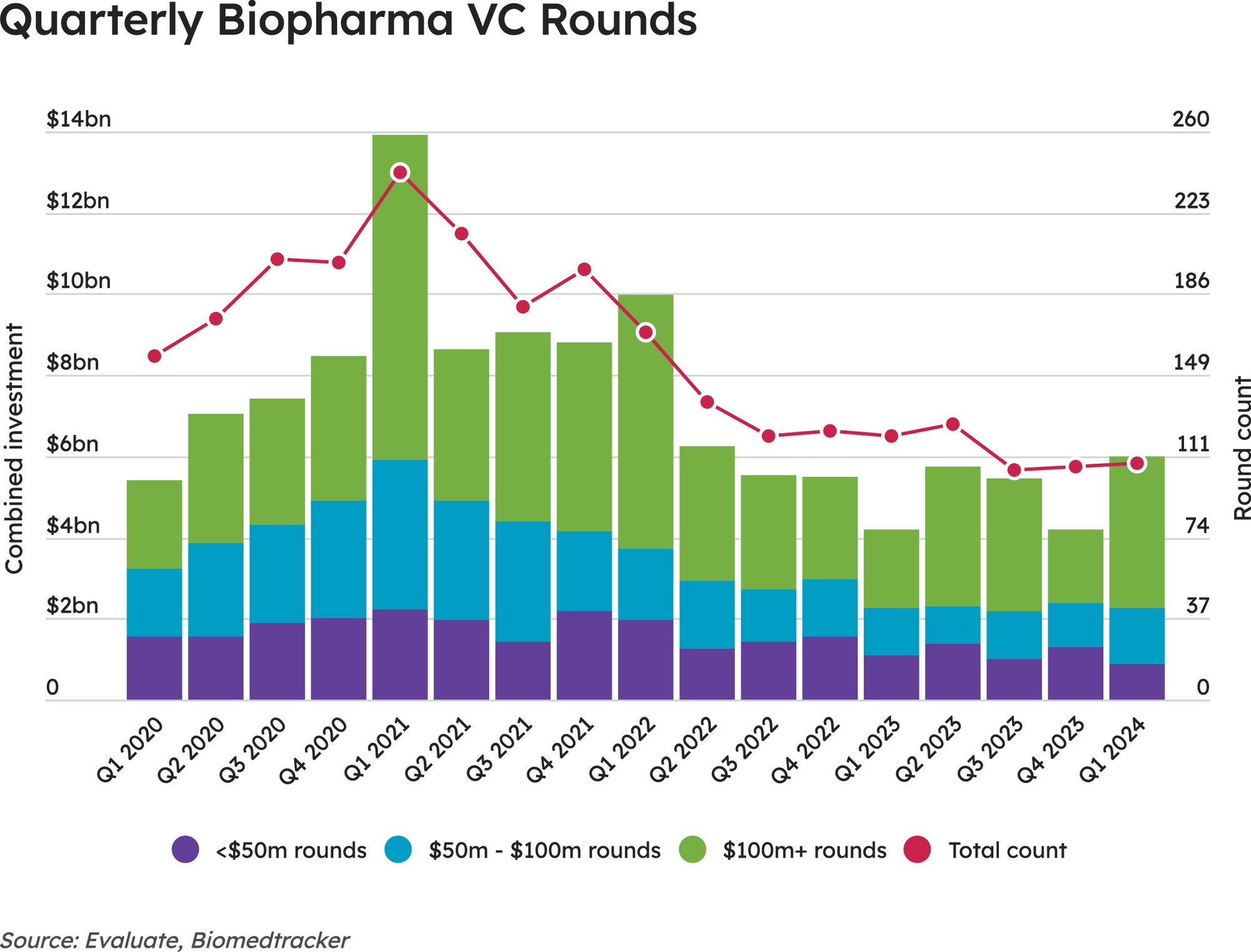 Biopharmaceutical companies have raised one venture capital mega-round after another in 2024 – with several of the $100m-plus financings often announced on the same day – and first quarter VC fundraising data from Evaluate show that big bets placed by investors on drug developers during the quarter added up to a rebound in venture financing.