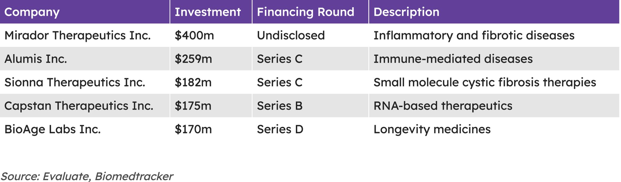Rounding out the top five fundraisers in Q1, Capstan Therapeutics Inc. raised a $175m series B round in March to fund its in vivo RNA technologies, starting with targeted lipid nanoparticles (tLNPs), including development of its lead tLNP program through clinical proof of concept. BioAge Labs, Inc. closed a $170m series D round in February to fund development of its muscle-sparing drug azelaprag, including Phase II trials in combination with Eli Lilly and Company’s Zepbound (tirzepatide) and other obesity drugs.