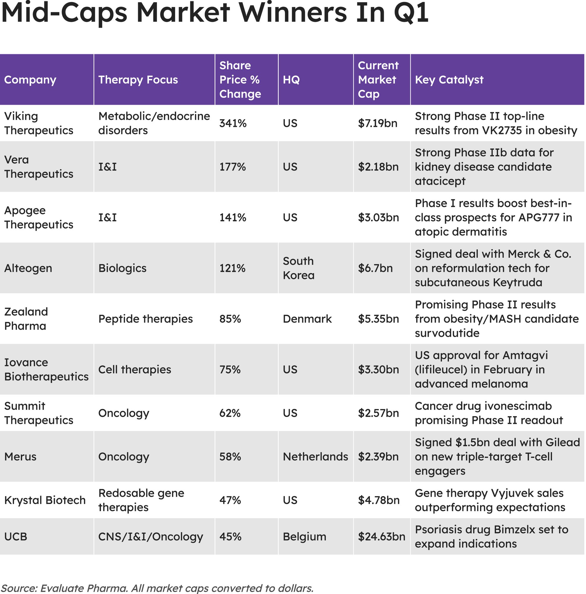 Viking Therapeutics’ share price soared in Q1 as generalist investors continued their landgrab of biopharma companies developing novel obesity therapies. That put it top of the share price gainers among mid-cap companies in Q1, according to data from Evaluate.