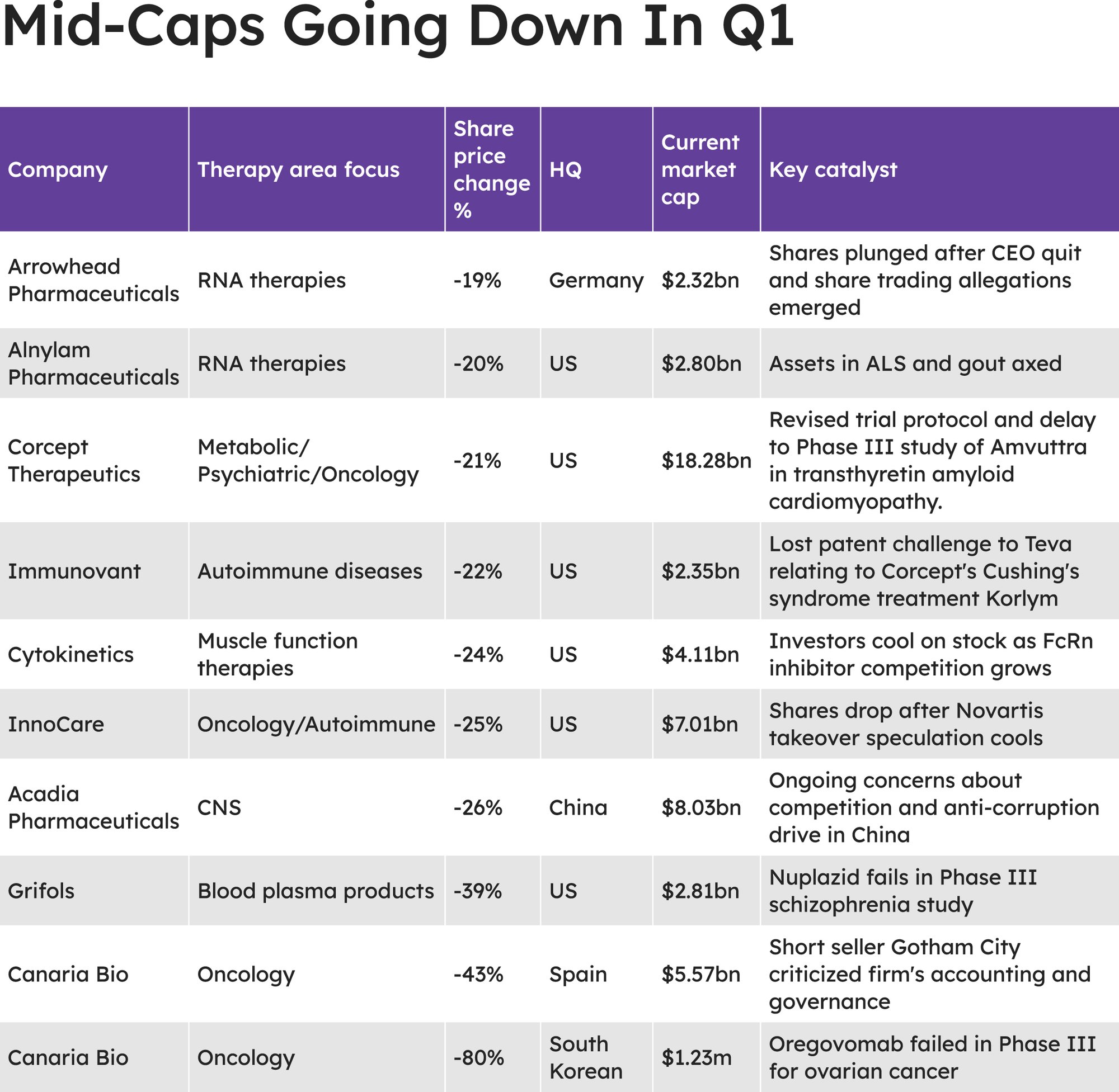 A more predictable reason was behind the decline of Acadia Pharmaceuticals, the failure of its antipsychotic Nuplazid (pimavanserin) in a Phase III schizophrenia study. It is looking to turn things around with a new head of R&D, the ex-Amgen scientist Liz Thompson, but is yet to see a recovery in sentiment.