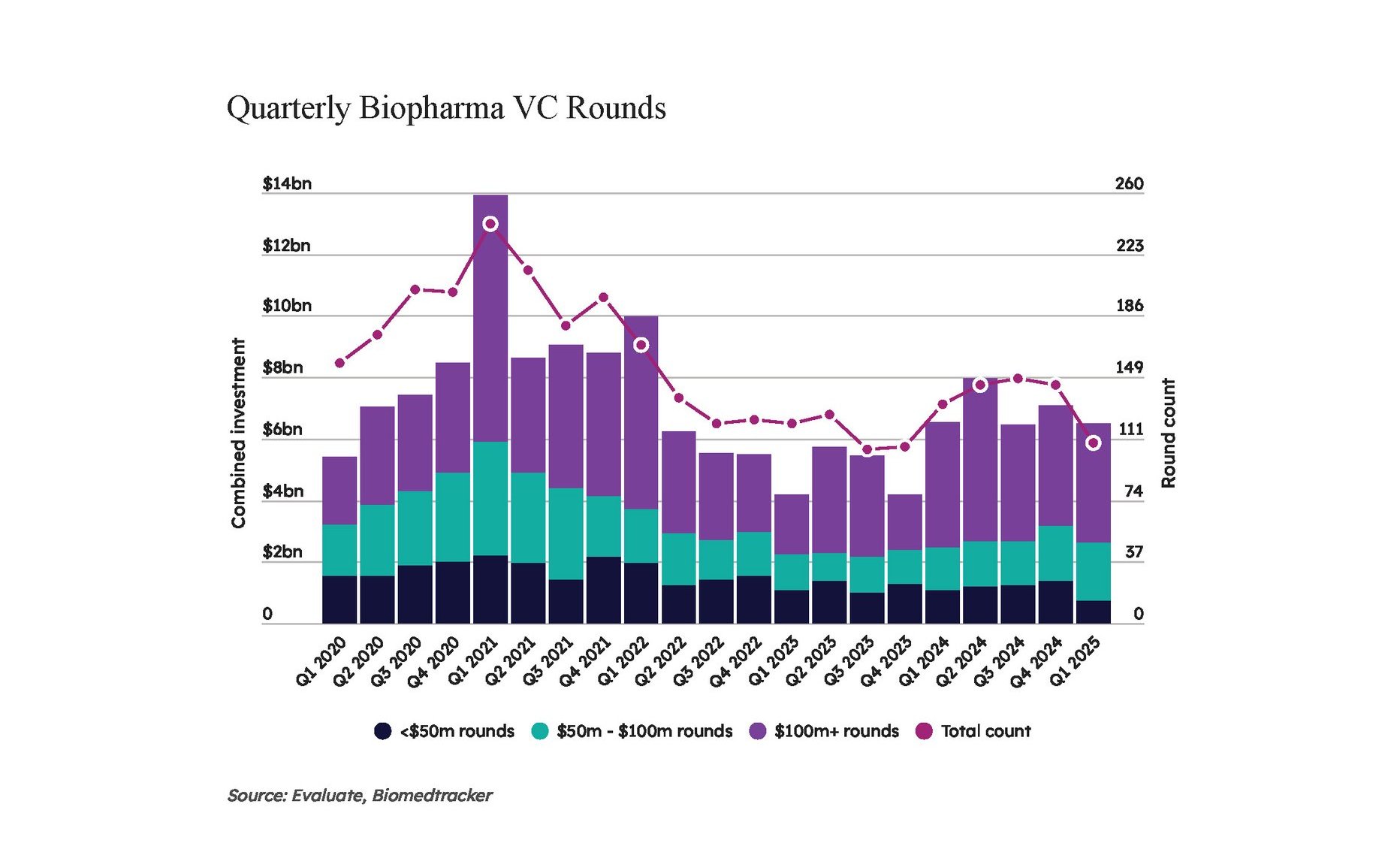 Venture capital financing for biopharmaceutical companies may be headed into another downturn, reversing a surge in start-up funding that occurred in 2024. New data from Evaluate show that only 109 drug development firms raised VC rounds in the first quarter of 2025, far below the quarterly average of 142 companies in 2024, with $6.49bn raised in Q1 of this year, versus the $7bn quarterly average last year.