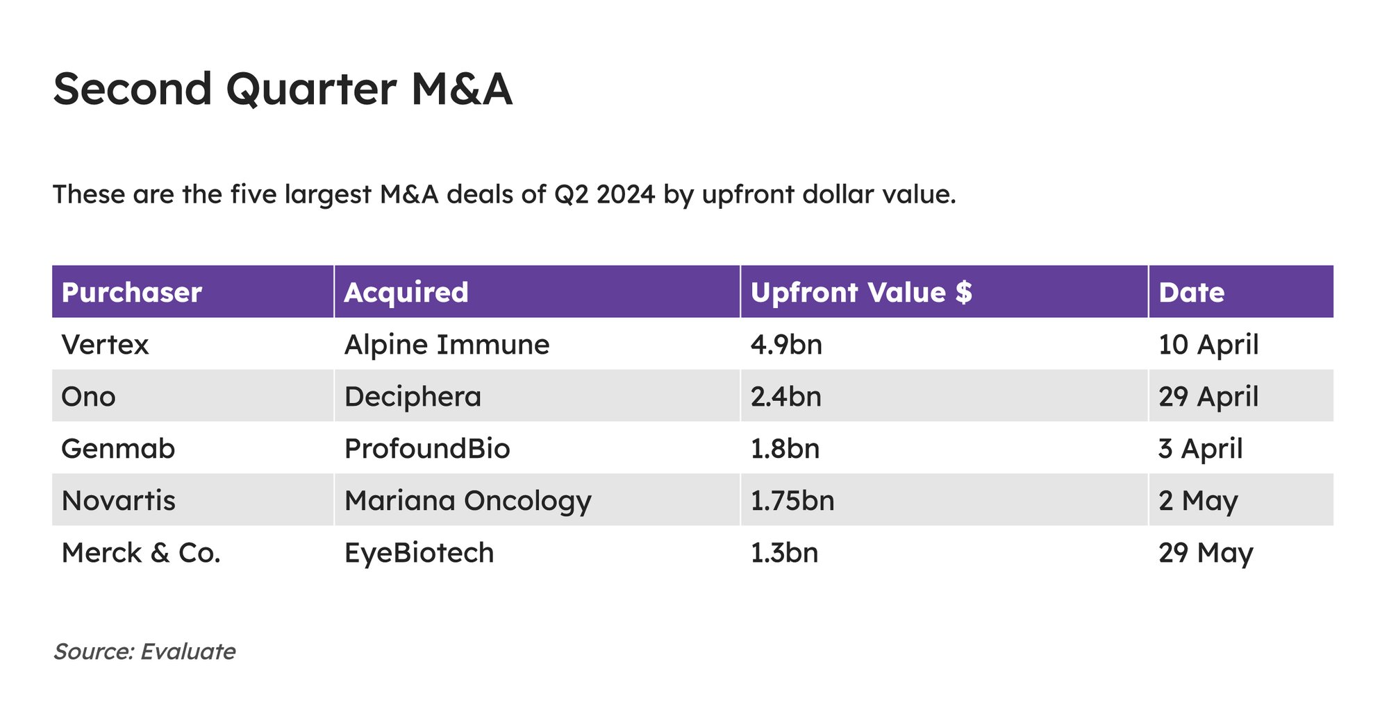 The buyers of companies valued at $1bn or higher during Q2 2024 comprised a mix that included large pharma firms like Novartis AG, Merck & Co., Inc. and Johnson & Johnson, Japanese biopharmas Ono Pharmaceutical Company, Ltd. and Asahi Kasei Pharma Corporation, as well as established biotechs such as Biogen, Inc., Vertex and Genmab A/S. Novartis and J&J each recorded its second M&A transaction valued at $1bn or greater during the quarter, after each announced one such deal during the first quarter.