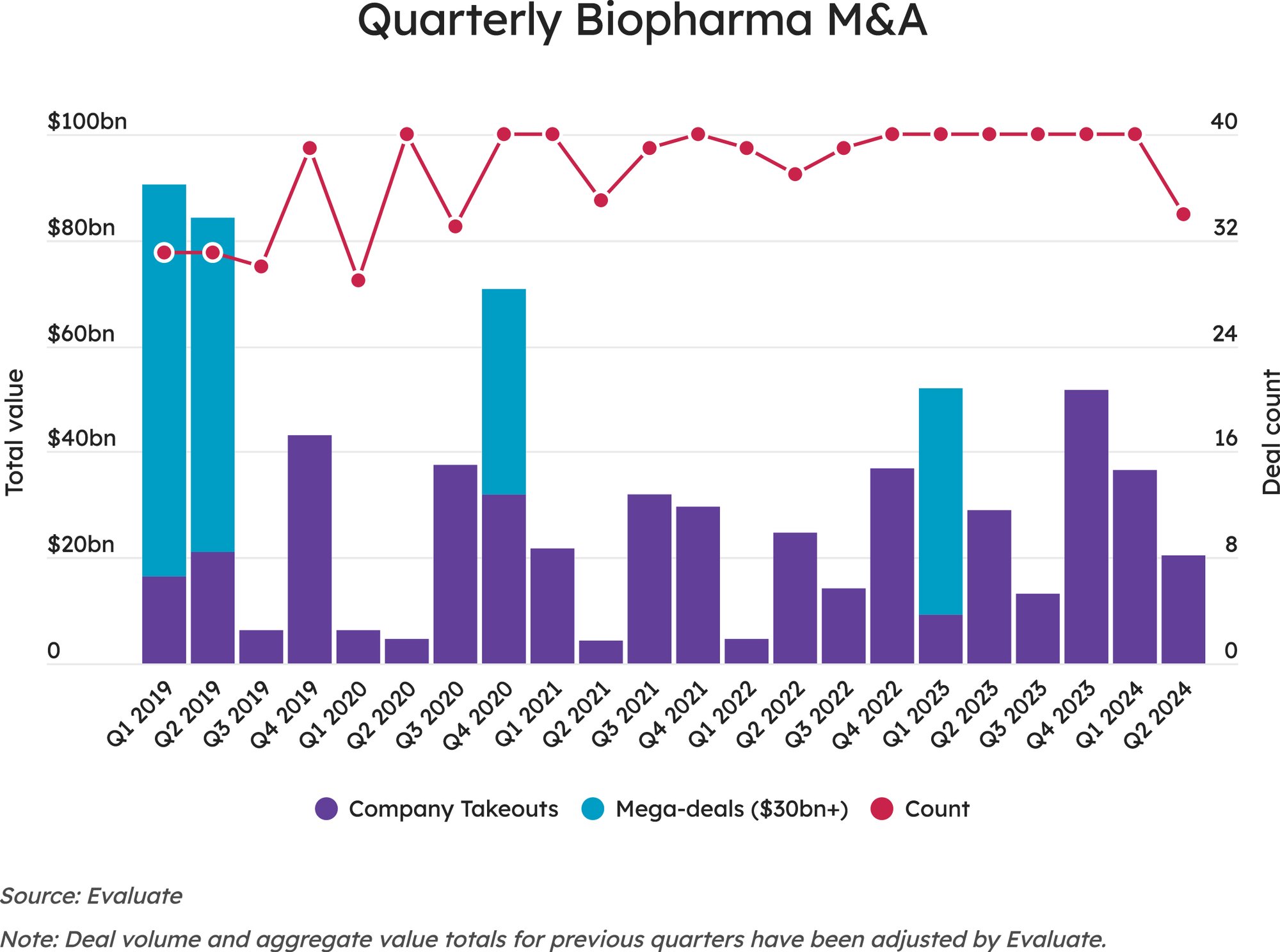 After a strong start to biopharma merger-and-acquisition activity in the first quarter of 2024, transactions declined notably in the second quarter, according to data provided by Evaluate. The second quarter saw 34 M&A transactions, down from 59 during the first quarter, while the aggregate dollar value of those deals came in just below $20.4bn.
