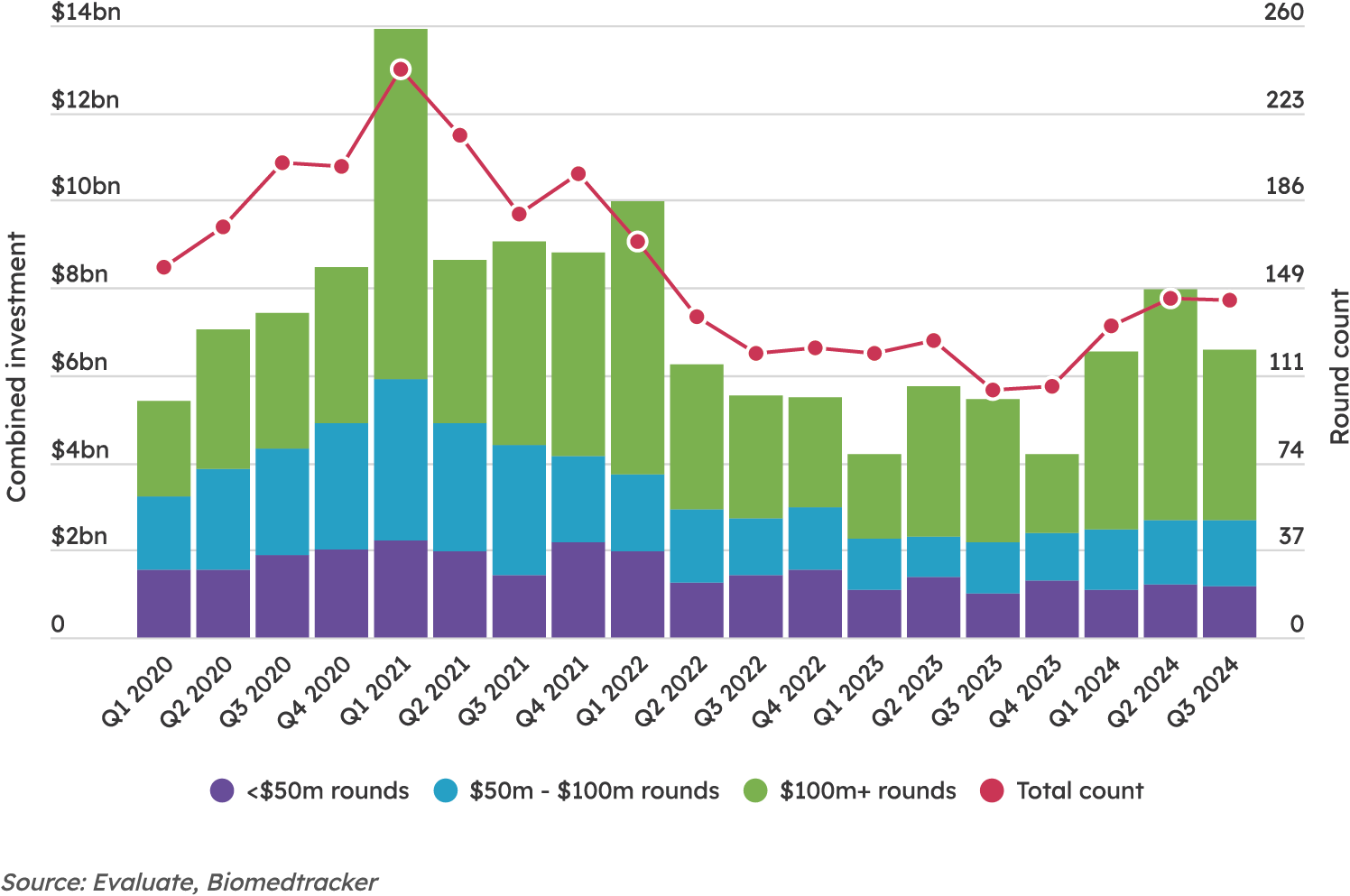 VC investment fell from $7.95bn in Q2 to $6.59bn in Q3, but the third quarter total was slightly higher than the $6.53bn that biopharma firms raised in Q1. All three quarters outpaced every quarter of 2023, so with $21.07bn in venture capital raised through the third quarter, 2024 already has surpassed the $19.61bn in VC investment across all four quarters of last year.