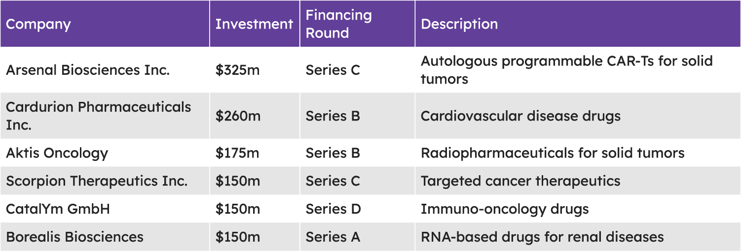 The third place VC fundraiser, Aktis Oncology, eked out a Q3 spot with its $175m series B round announced on 30 September to fund its radiopharmaceutical programs. Three companies tied for fourth place in Q3 with $150m financings: Scorpion Therapeutics, Inc., CatalYm GmbH and Borealis Biosciences.