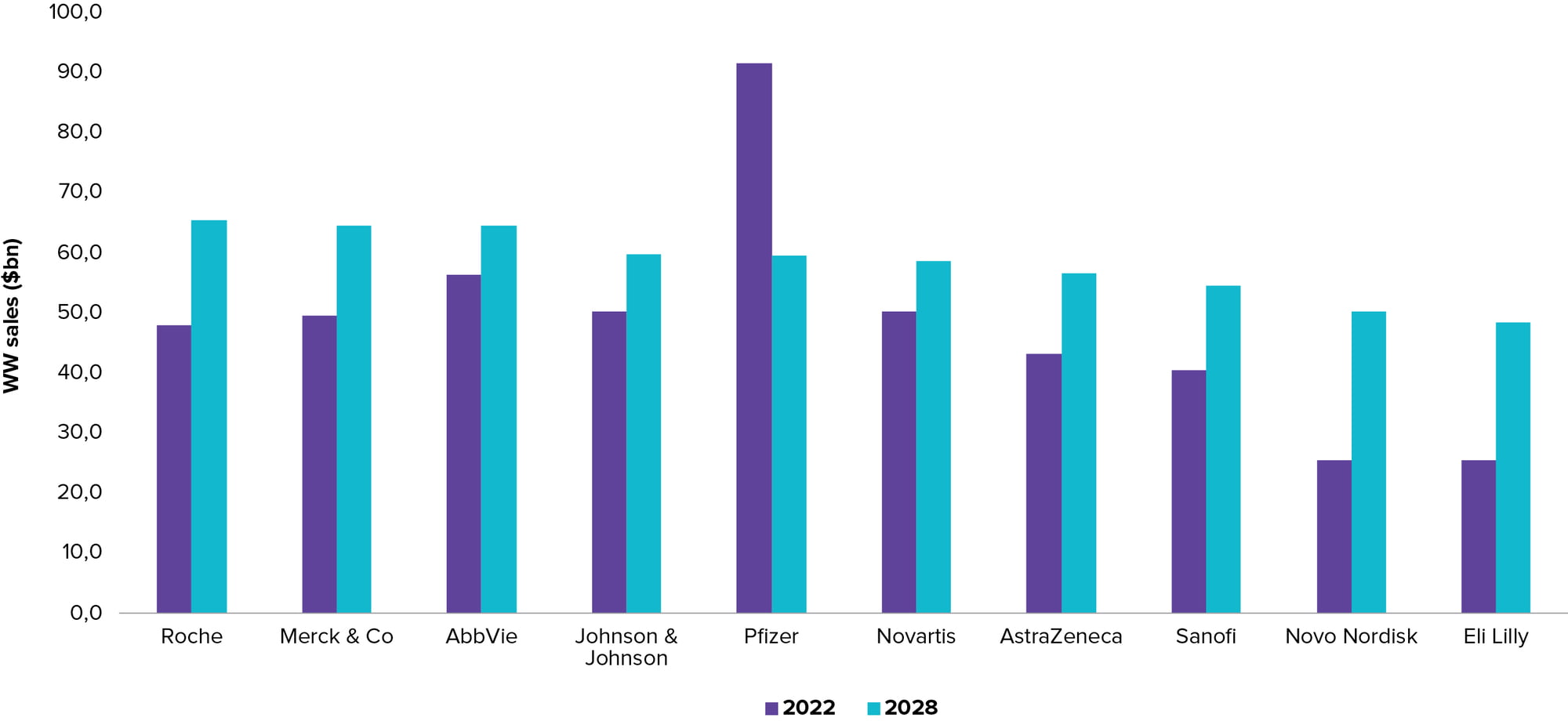This broad estate means that, based on current projections, the Swiss giant will keep Merck & Co from the top spot in 2028. With little between the top three companies’ sales forecasts that year, however, the order of names on the podium is far from finalised.