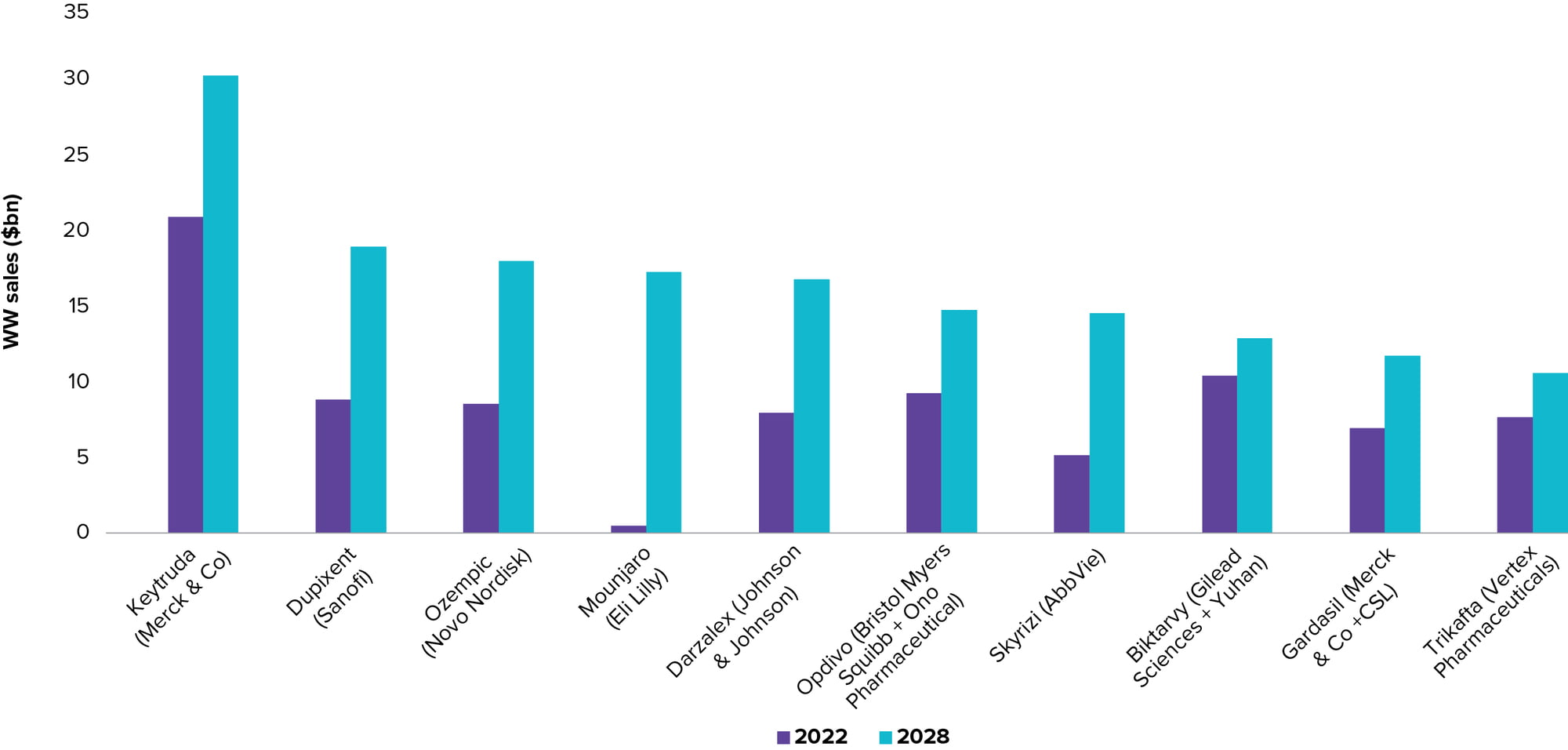 The huge sales these agents are seen generating will help Novo and Lilly push Bristol Myers Squibb and GSK from the top 10 by 2028, Evaluate Pharma predicts.