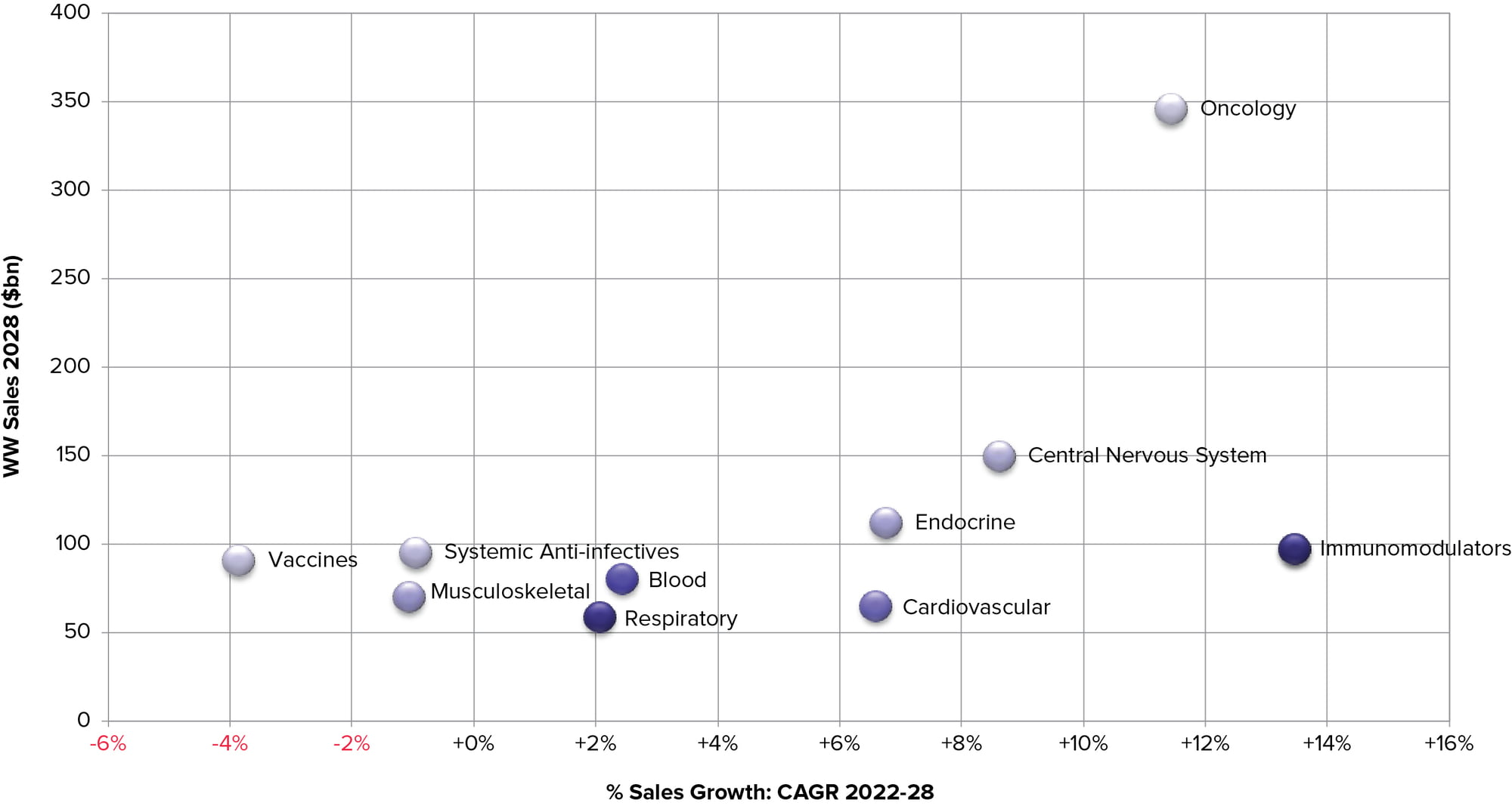 Oncology has seen huge levels of investment in the past few decades, and sales of cancer drugs already eclipse revenues made in other disease areas. This dominance is projected to grow, with oncology accounting for 22% of sector sales in 2028, up six percentage points from 2022.