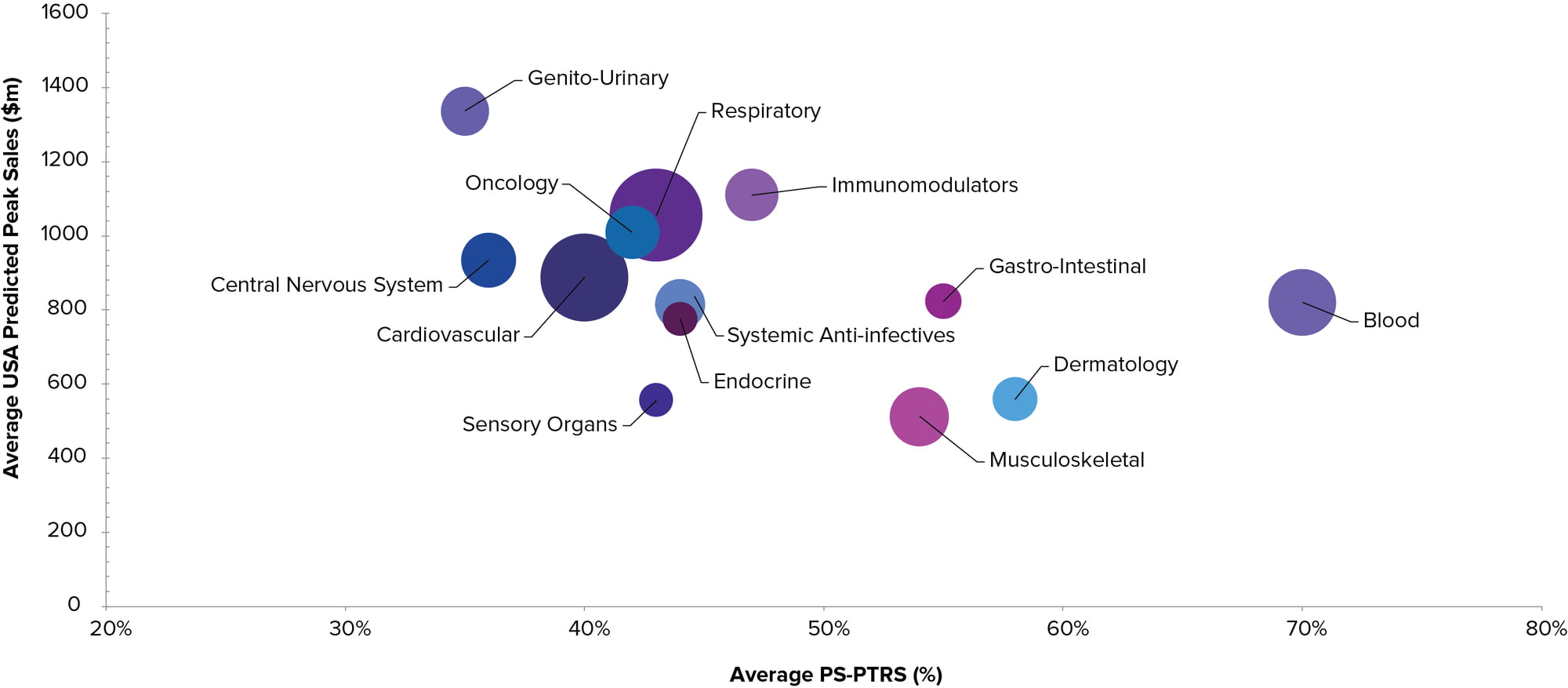The field of immunomodulators, for example, continues to attract much research money and is frequently the subject of business development. Average clinical development spend – indicated by the circle size – and PTRS sit close to the median for this therapy area, while the average peak sales is among the highest.