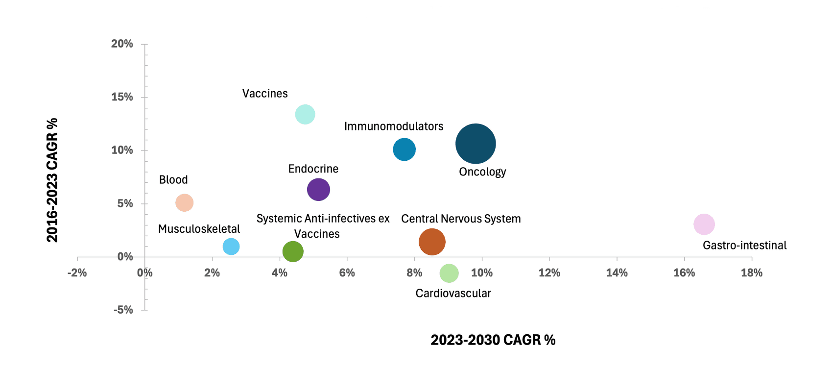 Oncology’s 9.8% forecast average annual growth to 2030 has slowed slightly relative to its 2016-2023 CAGR. But it still beats most other categories and is well above total prescription drug sales growth of 7.35%.