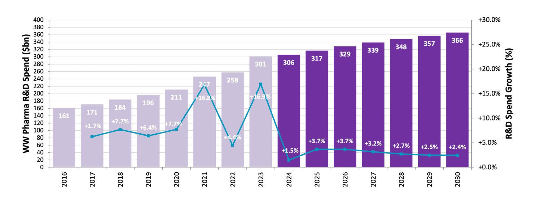 Pharma R&D spend is forecast to grow significantly more slowly in the second half of the decade than it did in the first: CAGR of over 9% in 2016-2023 shrinks to below 3% between 2023-2030. Combined R&D spend of over $300 billion in 2024 (27% of sales) falls to 21% of sales in 2030.